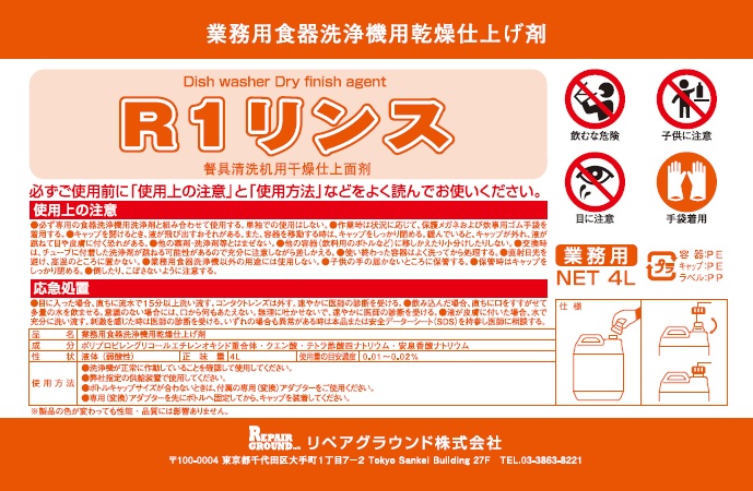 ホーム > 製品 > 洗剤 > [洗浄機用乾燥剤]R1リンス 4L